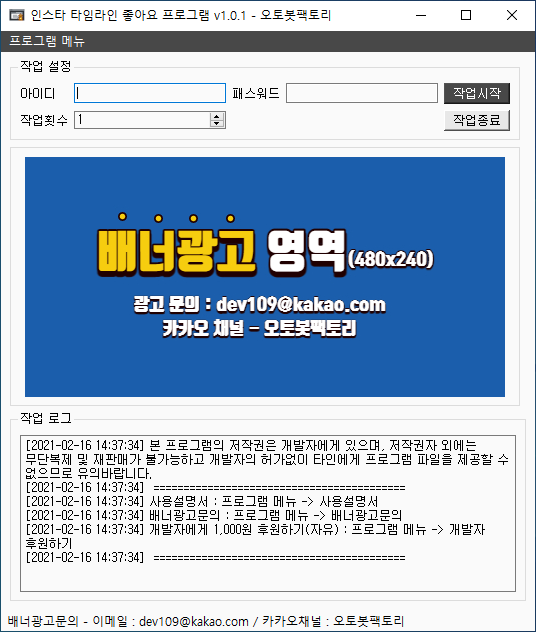 - 절대! 작업을 하는 인스타그램 계정으로 다른 프로그램과 동시에 작업하지마세요! 중복 작업으로인해 인스타그램측에서 프로그램 사용으로 인지할 수 있습니다.