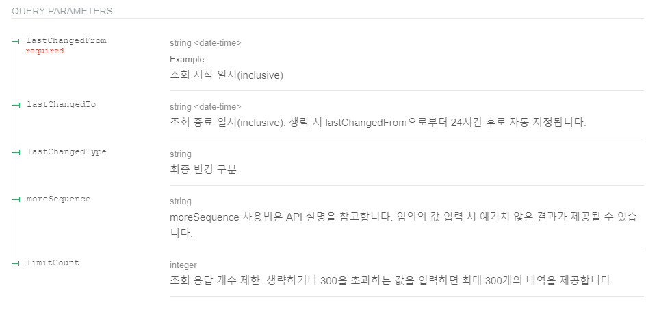 요청 파라미터중 조회 종료 일시(lastChangedTo)를 생략할 경우 조회 시작 일시부터 24시간 후로 자동 지정된다.