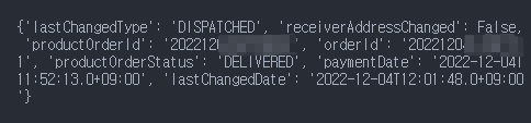 'lastChangedType' : 'DISPATCHED', #최종변경구분(PAYED : 결제완료, DISPATCHED : 발송처리)