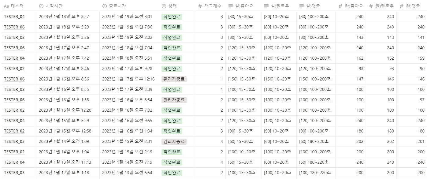 - 이 테스트를 통해 적절한 해시태그 개수와 작업 개수, 작업 시간등을 확인하시길 바랍니다.