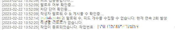 작업중 '팔로워 수, 피드 개수를 수집할 수 없습니다.' 라는 멘트가 연속으로 발생하여 작업이 종료되는 경우에 대해 안내해드리겠습니다.