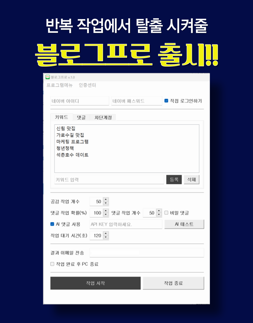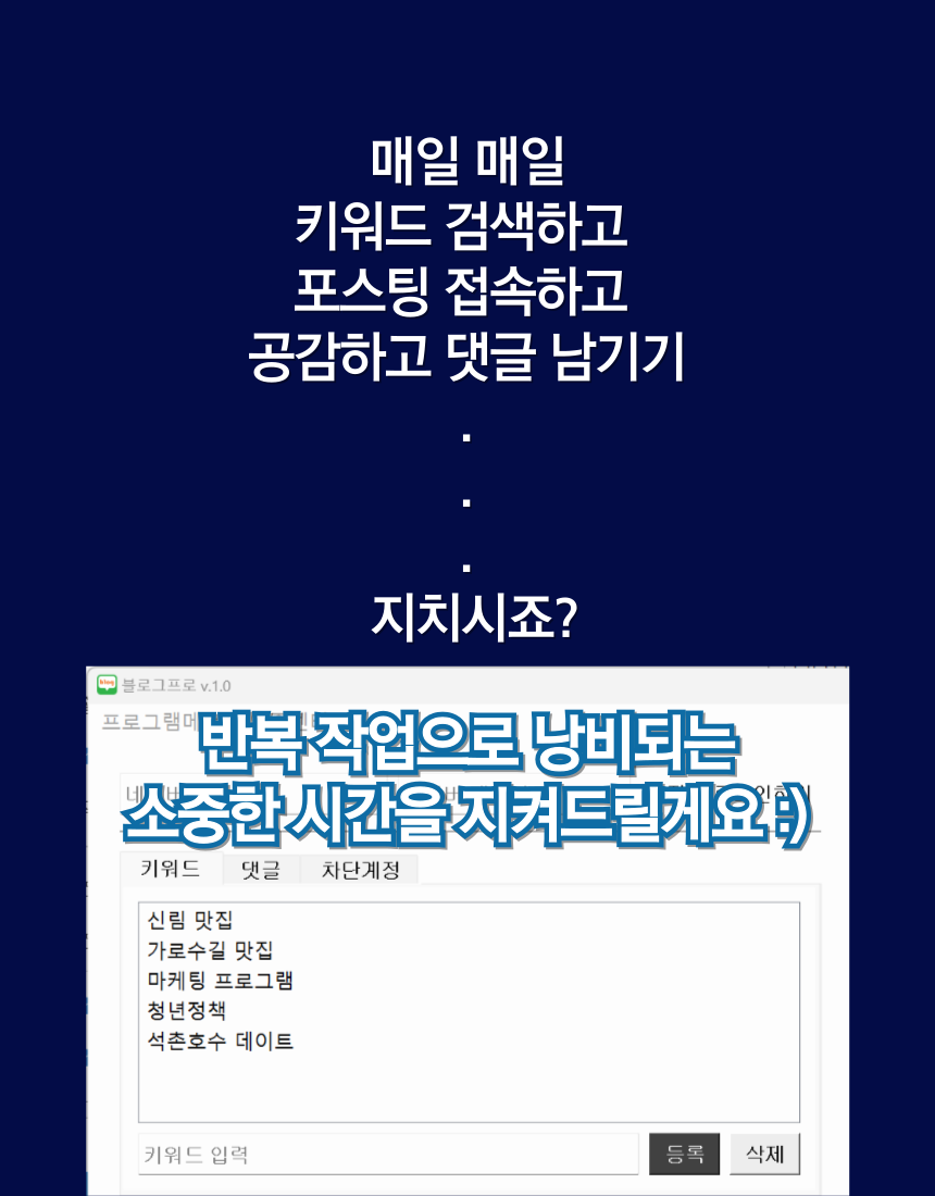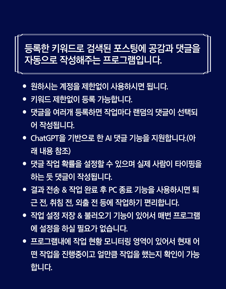 매일 직접 키워드 검색하고, 포스트에 접속하고, 읽고, 공감하고, 댓글남기기 지치신 분들을 위한 프로그램이 제작되었습니다.