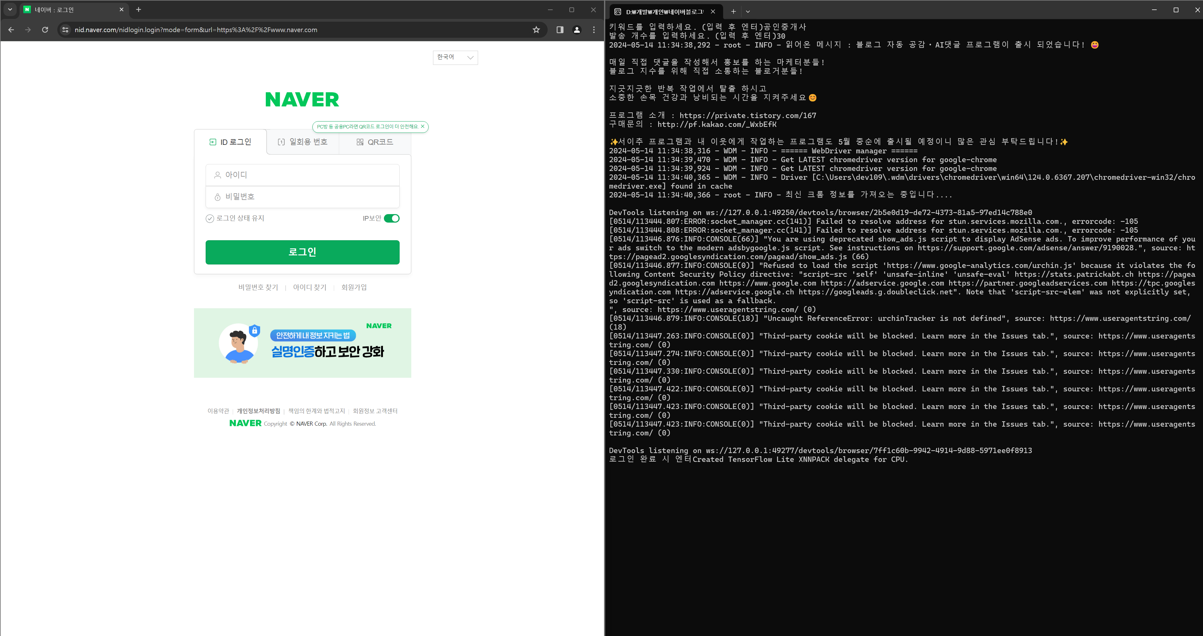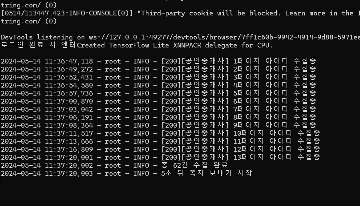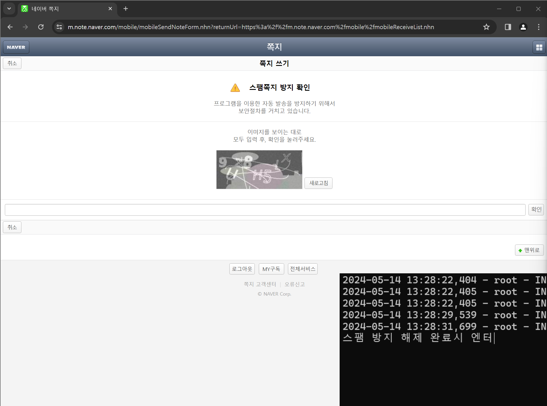 ➡️ 스팸 방지가 나올 경우 프로그램이 알아서 감지한 후 일시정지 상태가 되니 보안 문자 입력 후 해제가 되었다면 다시 프로그램 클릭 -> 엔터 하시면 자동 진행됩니다.