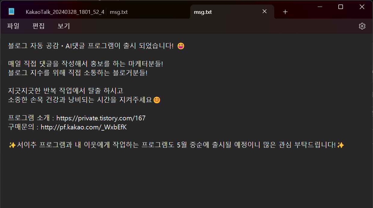 ➡️ msg.txt 파일은 댓글 내용을 등록하는 파일입니다. 댓글 내용을 등록하지 않을 경우 프로그램이 작동하지 않습니다. (파일명, 파일 위치 변경 불가)