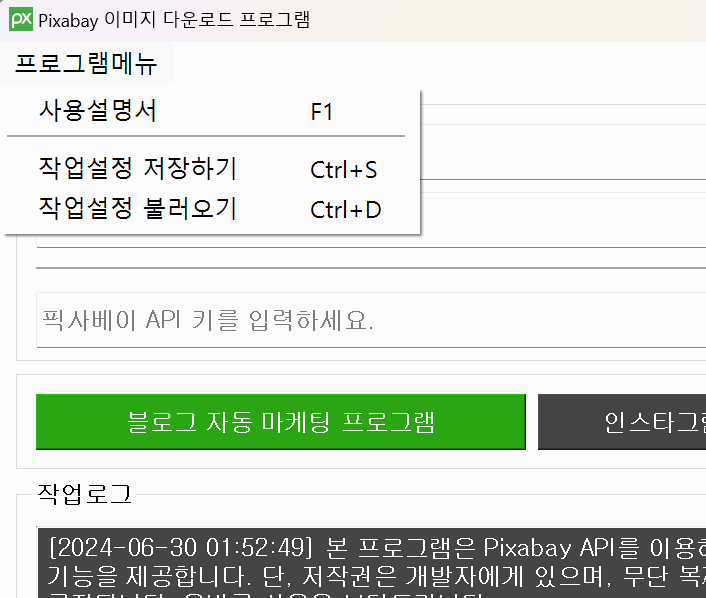 1. 프로그램 실행 후, 발급받으신 Pixabay API키를 입력합니다. (Pixabay 계정 생성 후 무료 발급 가능 - 자세한 내용은 아래를 참고하세요.)