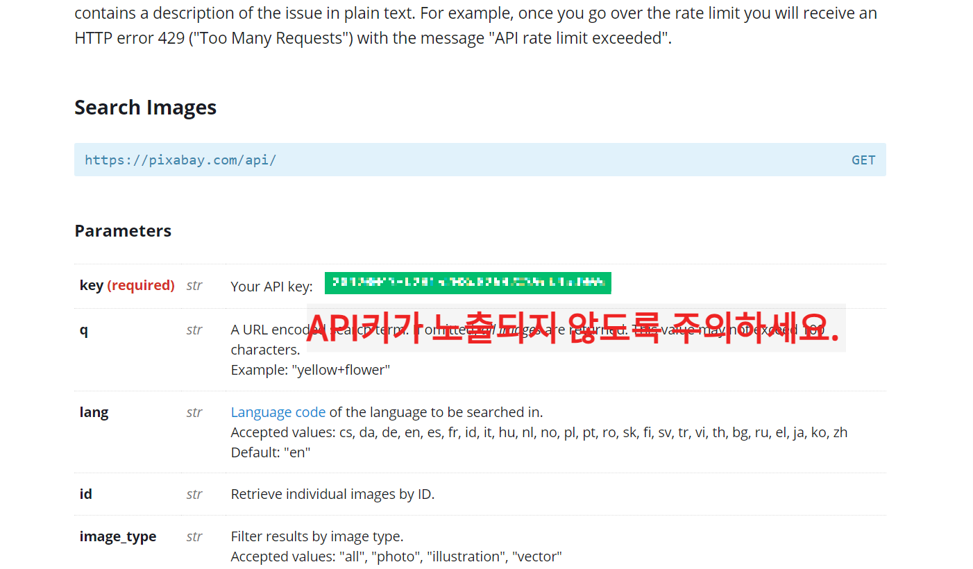 3. 이동한 페이지(https://pixabay.com/api/docs/)에서 스크롤을 약간만 내리면 API 키가 표시되어 있습니다.(아래 이미지에서 모자이크 처리된 부분) 복사해서 프로그램에 붙여넣으시면 됩니다.