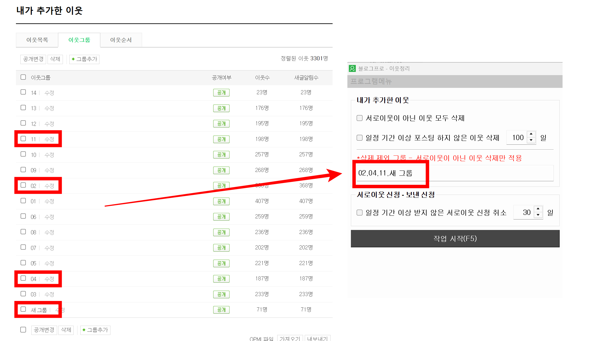 - 서로이웃 상태가 아니더라도 삭제를 원하지 않는 그룹이 있다면 입력해주세요.