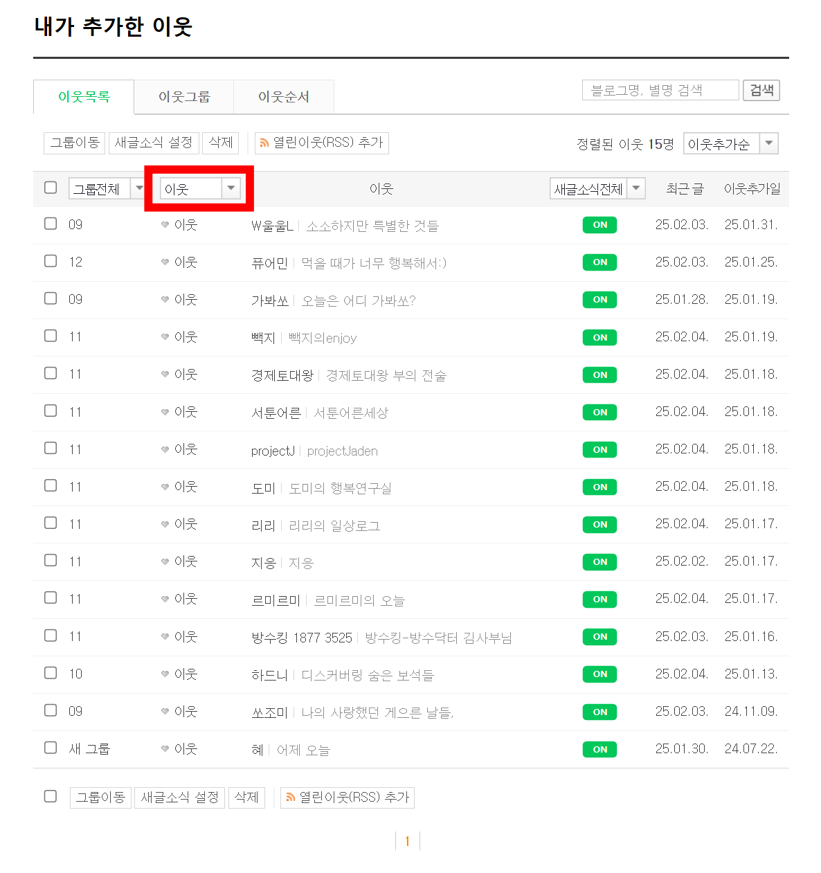 - 내가 추가한 이웃에서 서로이웃이 아닌 '이웃'을 삭제하는 작업입니다.
