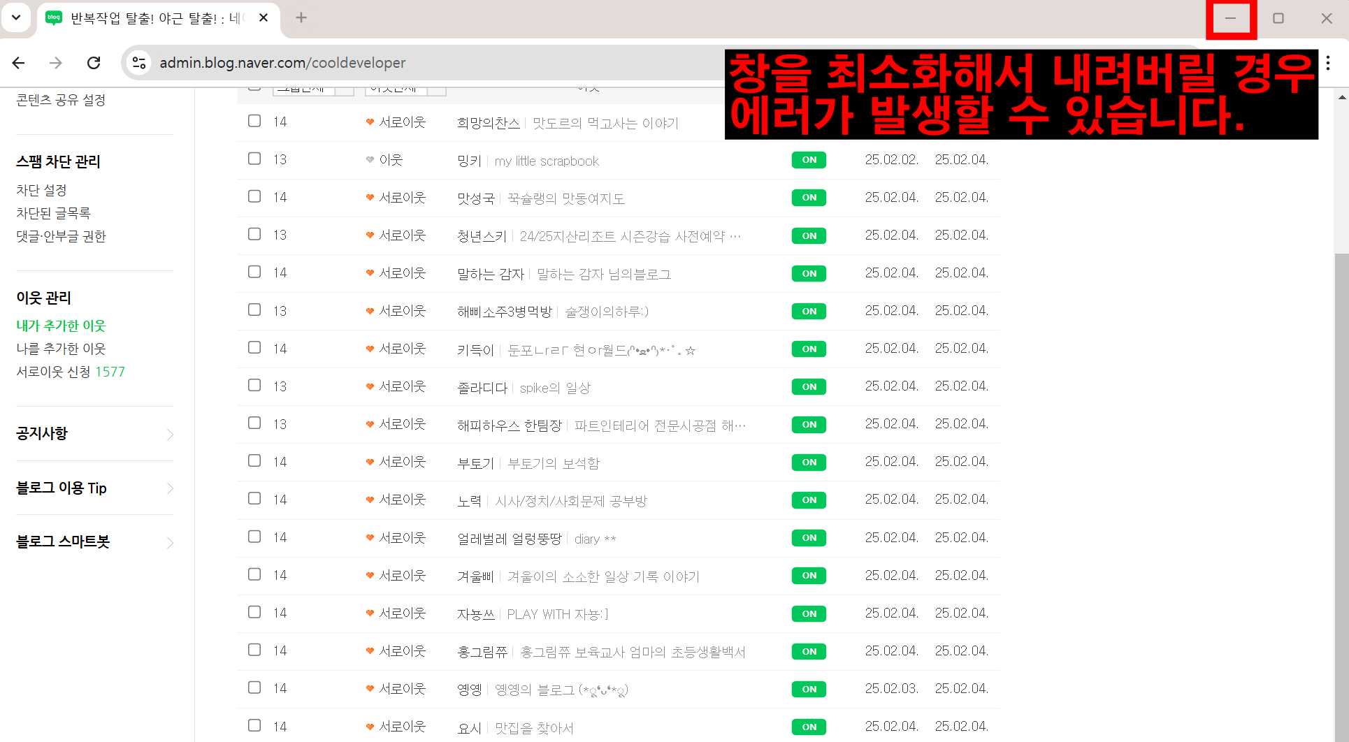 - 시간이 오래 걸리는 작업이 아니니 이웃 정리를 진행하시는 동안은 다른 작업을 하지 않는걸 추천해드립니다!