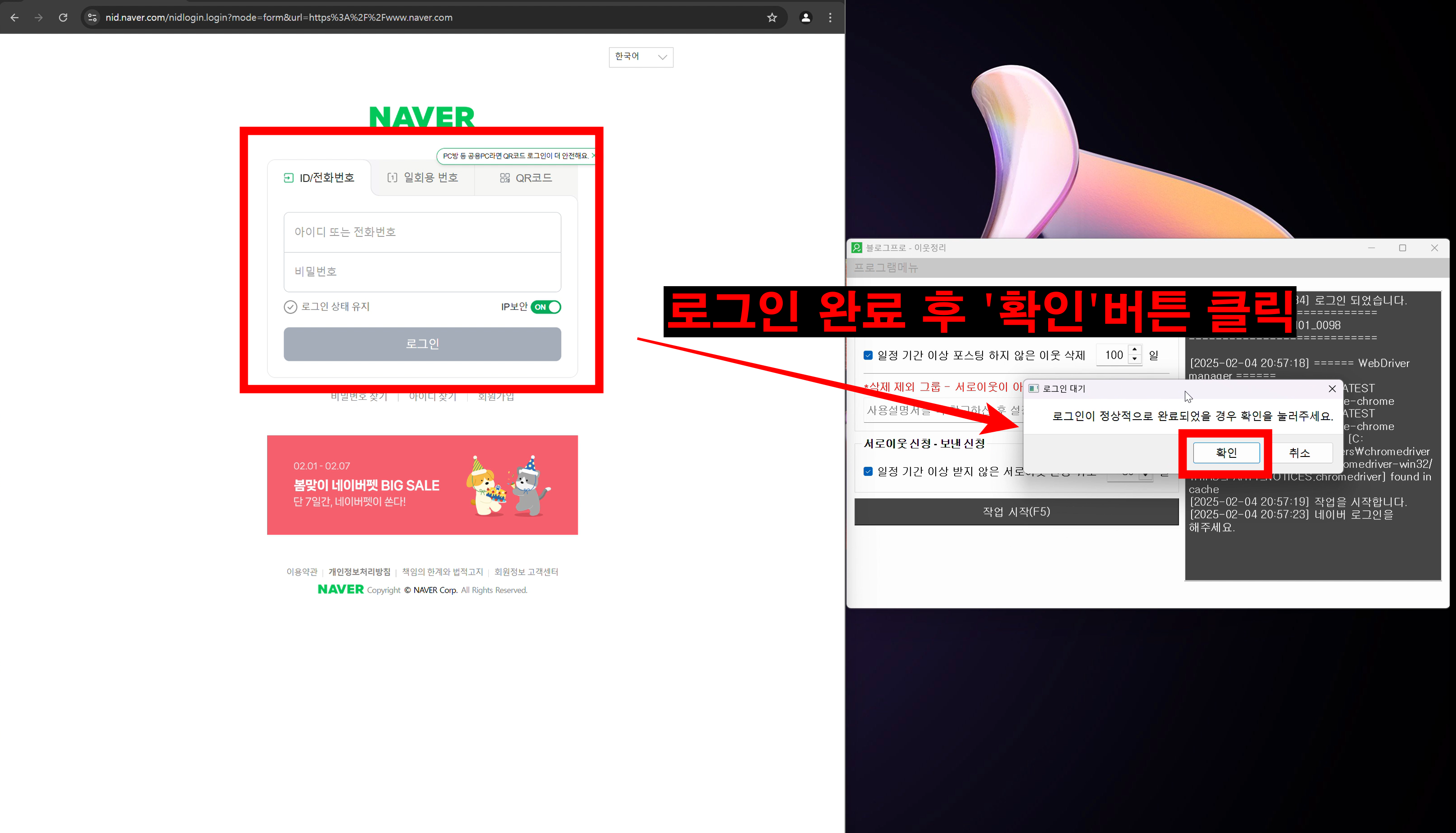 - 작업을 시작하시면 네이버 로그인 화면으로 이동합니다. 블로그프로 - 직접 로그인 기능과 동일하게 직접 로그인 하신 후 로그인이 완료되었다는 버튼을 눌러주시면 작업 진행됩니다.