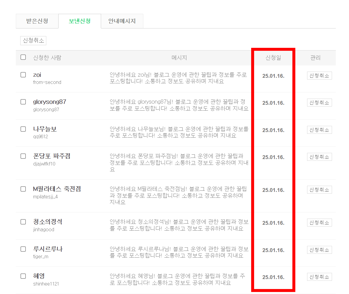 - 지정한 기간동안 이웃 신청을 수락하지 않은 신청을 취소합니다.