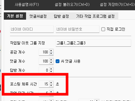 - 포스팅 체류 시간을 설정하실 경우 '작업 대기 시간'은 2초 정도로만 하셔도 됩니다.