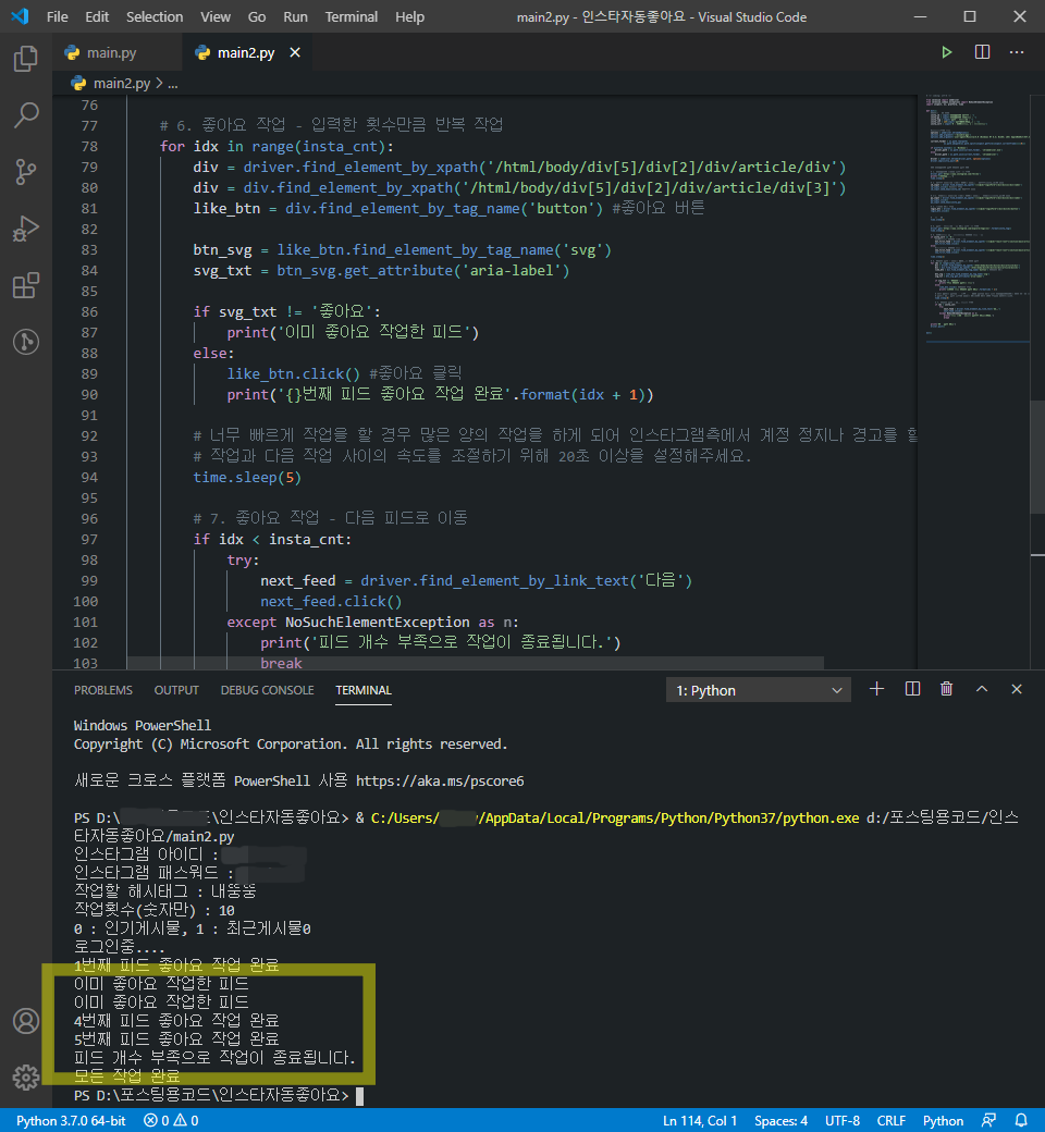 인스타그램 자동 좋아요 기능이 완성되었습니다. 다음 포스트에서는 자동 댓글을 작성하는 기능을 추가하도록 하겠습니다. 광고 클릭은 포스트를 작성하는데 큰 힘이 됩니다!