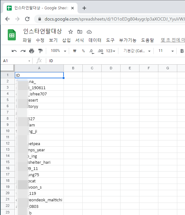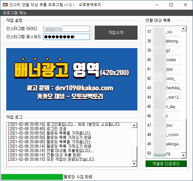 라는 멘트가 작업 로그에 출력되면 프로그램 오른쪽 화면의 언팔 대상 목록에 언팔 대상의 아이디가 출력되고, 목록 아래에 있는 엑셀로 다운로드 버튼을 누르면 언팔 대상 목록을 엑셀로 확인할 수 있습니다.
