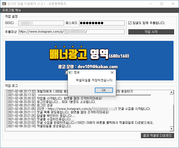 원하는 인스타그램 피드의 댓글을 수집해 엑셀 파일로 다운로드 받을 수 있는 프로그램입니다. 업데이트 21/02/09 다운로드